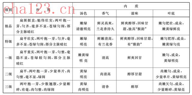太平猴魁茶按品质分为极品、特级、一级、二级、三级,五个级别。各级别感官特征如下: