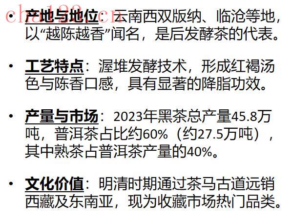 中国六大茶类的代表茶及其核心信息,结合行业数据与文化背景进行综合分析:第一类、黑茶代表:普洱茶(熟茶)