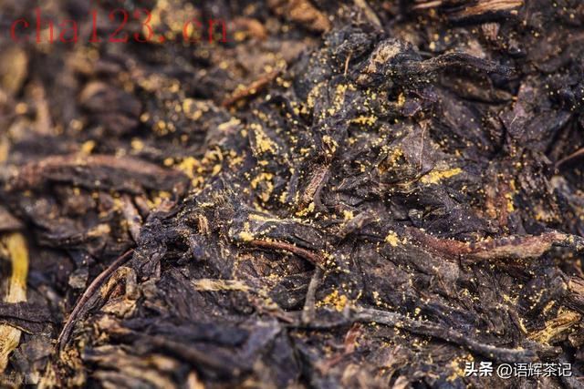 茶饼上星星点点的黄色“金花”(黄点),是陈年老茶的标志,非常珍贵。