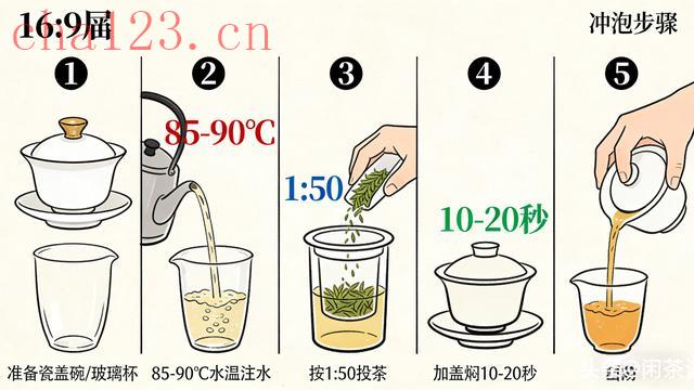 茉莉花茶冲泡步骤示意图,85–90℃水温、1:50茶水比是冲泡出佳味的关键