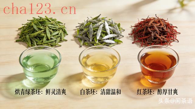 茉莉花茶三大主流茶坯(烘青绿茶、白茶、红茶)的干茶与茶汤对比,不同茶坯风味各有特色