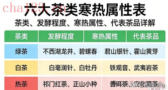 ① 看味道:酸甜辛偏热,苦酸偏寒温热派:味甜、味辛的食物,大多接受阳光照射更充足,比如大蒜、石榴、红枣。寒凉派:味苦、味酸的食物,性子偏凉,比如苦瓜、苦菜、梅子、木瓜。② 看颜色:红橙偏热,绿色偏寒温热派:颜色偏红的植物,果实能吸收更多阳光能量,比如辣椒、胡椒、石榴。寒凉派:绿色植物贴着地面生长,吸收地面湿气,比如绿豆、菠菜、油麦菜。③ 看生长环境:陆生偏热,水生偏寒温热派:长在旱地里的食物,耐干、水分少,比如花生、土豆、生姜、山药。寒凉派:水生植物 “泡” 在水里长大,湿气重,比如莲藕、海带、紫菜。④ 看生长位置:向阳偏热,背阴偏寒温热派:长在高空或东南向阳处的食物,光热充足,比如向日葵、栗子。寒凉派:背阴朝北生长的食物,少见阳光,比如蘑菇、木耳。⑤ 看生长季节:冬夏偏寒,春秋平和寒凉派:冬天生长的食物寒气重(大白菜、白萝卜、香菇),夏天生长的食物雨水足(西瓜、黄瓜、梨),性子都偏凉。平和派:春秋季生长的食物,寒热属性更温和,比如春季的春笋、秋季的苹果。划重点!六大茶类的 “寒热档案”搞懂食物的寒热规律,再看茶叶就简单多了。茶叶的寒热属性,主要由发酵程度决定。