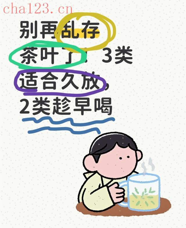 总结一下:普洱、白茶、黑茶,这三类放心存;绿茶、黄茶,趁早喝,过期扔;红茶、乌龙,适量存,尽快喝。记住这个口诀,家里茶叶再也不会乱存、乱喝、乱浪费。