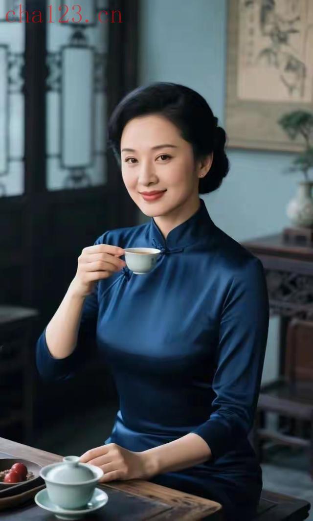 品茶的蓝衣美女
