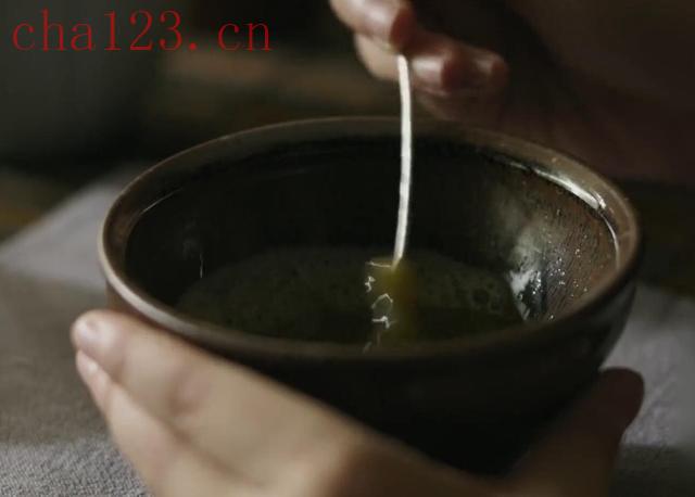 之后就是这点茶的五个步骤,煎水,就是烧水,这个不用多说了,然后是碾茶,就是把茶饼捣碎,碾成末,茶末要研碾细腻,所以要过筛,接下来需要温盏,就是开水把器具浇一下,之后把研细的茶末放进茶盏,再加入少许的沸水,调成膏,这一步叫调膏。接着一手执壶往茶盏里面点水,另一个手用茶筅朝一个方向旋转打击,拂动茶盏里的茶汤,让它泛起汤花和泡沫,这一步就叫击拂。这一波也是考验功力的做茶人功夫的时候,击拂后茶汤的颜色呈乳白色茶汤表面泛起的汤花能够较长时间凝住于杯盏内壁不动这就叫做咬盏。一杯好茶的标准一是汤色以纯白为上,青白、灰白、黄白,则等而下之;二是汤花也就是上面的泡沫泛起后,水痕出现的早晚,早者为负,晚者为胜。如果茶末研碾细腻,点汤、击拂恰到好处,汤花匀细,有若“冷粥面”,就可以紧咬盏沿,久聚不散。这种最好的效果,就叫“咬盏”。