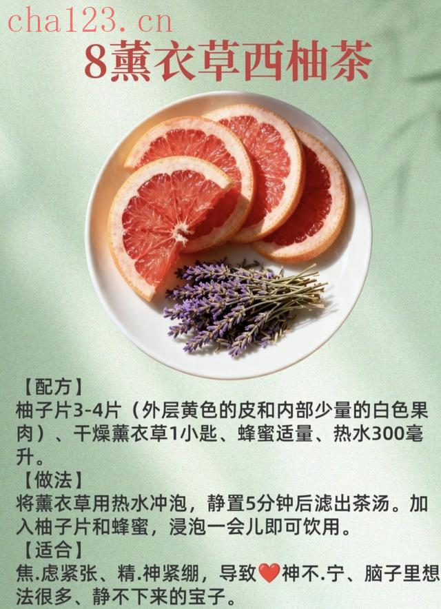 8. 薰衣草西柚茶——安神助眠做法:薰衣草一小撮、西柚片2片,热水冲泡焖10分钟。
