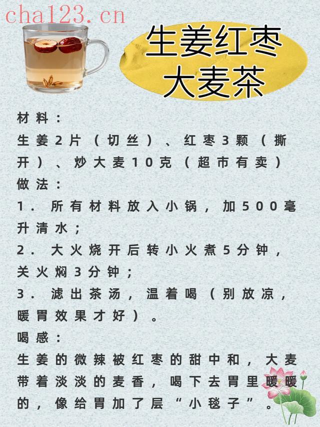 生姜驱寒暖胃,红枣补气血,大麦健脾消食,适合胃寒、吃点凉的就不舒服,或冬天胃里总觉得“凉飕飕”的人。