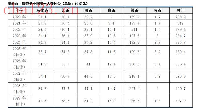 绿茶为第一大种类,占中国整体茶行业规模一半以上。2024 年,中国茶行业规模 3258 亿元,其中绿茶接 近 2000 亿元,为第一大茶品种,也是中国历史最为悠久的茶类。红茶排名第二,市场规模为 541 亿元。乌龙茶 与黑茶市场规模相近,都在 300-400 亿元区间。白茶和黄茶相对而言最为小众,白茶为 104 亿元,而黄茶规模 仅为 29 亿元。
