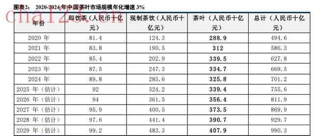 2024 年,线上渠道和线下渠道在中国茶叶市场中的占比分别约为 11.0% 和 89.0%,线下依然占据主流 地位。 其次,分销依然是茶叶销售的主流模式。分销模式可助力茶企快速拓展市场覆盖范围,而直销模式则更利 于统一品牌形象、把控服务质量与定价体系。不过,直销模式需要较高的资金投入与运营效率支撑。具备强劲 经营管理能力的茶企,可在分销模式下有效发挥品牌影响力与质量管控优势。尽管两种模式在中国市场均较为 常见,但分销模式的应用更为广泛。通常情况下,茶企会采用分销与直销相结合的运营模式。 按销售收入计算,中国茶叶市场规模从 2020 年的约 2889 亿元人民币增长至 2024 年的约 3258 亿元人 民币,复合年增长率约 3.0%。其中: (i) 直销模式市场规模由 2020 年的约 955 亿元降至 2024 年的约 905 亿元,复合年增长率约 - 1.3%; (ii) 分销模式市场规模从 2020 年的约 1934 亿元增至 2024 年的约 2353 亿元,复合年增长率约 5.0% 。 预计到 2029 年,中国茶叶市场规模将从 2024 年的约 3258 亿元增长至约 4079 亿元,复合年增长率约 4.6%。其中: (i) 直销模式市场规模预计从 2024 年的约 905 亿元增至 2029 年的约 1109 亿元,复合年增长率约 4.2%; (ii) 分销模式市场规模预计从 2024 年的约 2353 亿元增至 2029 年的约 2969 亿元,复合年增长率约4.8%。 2024 年,直销模式与分销模式在中国茶叶市场中的占比分别约为 27.8% 和 72.2%。