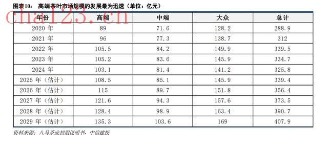 三、高端茶叶发展最为迅速,行业潜力广阔茶叶市场按价格范围可进一步分为三类:高端、中端和大众。在消费升级和健康意识崛起的环境下,高端 茶叶明显发展最为迅速,行业潜力广阔。 在 2020 年至 2024 年期间,中国高端茶叶市场展现出稳定增长态势。按销售收入计算,市场规模从约 890 亿元人民币增长至约 1031 亿元人民币,复合年增长率约为 3.7%。这一增长主要得益于消费者对全面健康和自 我保健的追求不断提升,以及对优质茶叶的需求持续走高。 高端茶叶以严苛的品质把控为显著特征:从原料筛 选、生产工艺到储存方式、包装设计均遵循高标准,这也使得其产品定价相对较高。与此同时,高端茶叶品牌 凭借优质的产品和服务,往往能建立较高的客户忠诚度,并提供精细化的客户服务体验。 相比之下,大众茶叶 市场的增长动能有所放缓。深层原因在于,随着居民可支配收入增加与健康意识觉醒,越来越多消费者正从非 品牌大众茶叶转向信赖度更高的品牌产品。据预测,到 2029 年,大众茶叶市场规模按销售收入计算将达约 1690 亿元人民币,而高端茶叶市场规模预计将增长至约 1353 亿元人民币。 这一市场结构的转变,深刻反映出中国 茶叶消费者对品质与品牌认知的双重升级,也为高端茶叶市场的持续扩张提供了强劲驱动力。