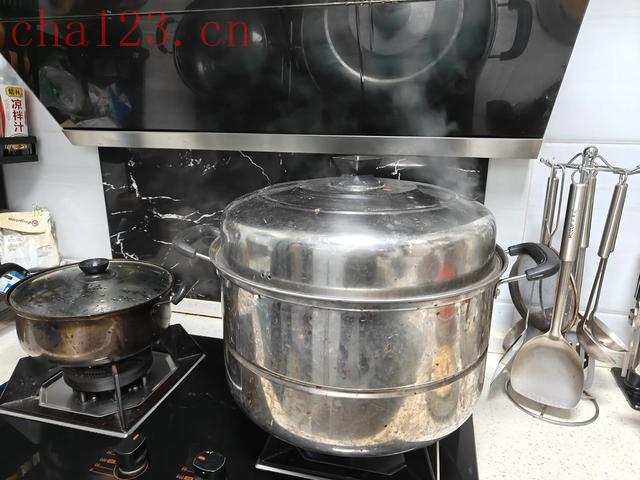 我先将摘净的新鲜蒲公英用清水洗干净后放到篦子上控水,然后放进蒸馍锅里待蒸汽上来后蒸上三分钟进行杀青,再取出放凉,为节省时间我等它们放凉后直接上手诺去它们的水份,由于蒲公英棵较大,我又将它们放到案板上切上几刀,最后经直放入铁锅中开炒。