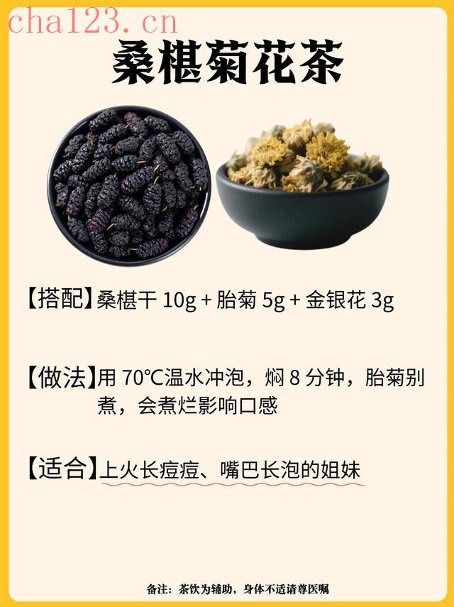 这茶喝着是桑椹的甜混着菊花的清苦,还有点金银花的淡香,喝着特别清爽。我上火长痘痘、嘴巴长泡的时候就喝这个,喝上两天火就能下去点,不过这个是凉性的,别天天喝,尤其是脾胃虚的朋友,一周喝2次就行。