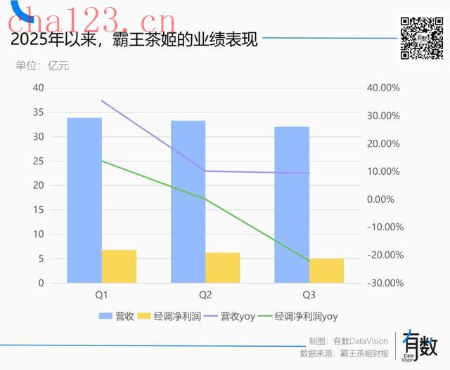 一边是收入规模与盈利能力出现下滑。今年三季度,霸王茶姬营收同比下滑9.4%,经调净利润同比下降22%。