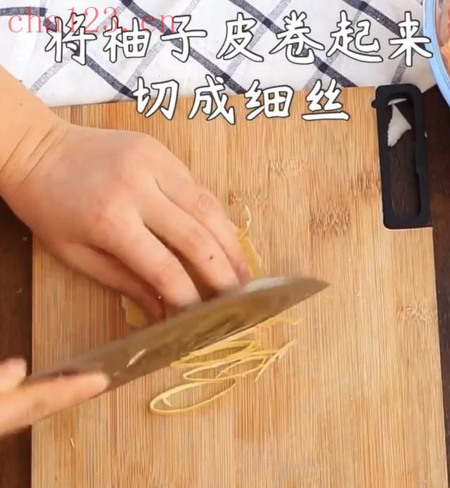 ✅ 剥柚子肉的时候把籽都挑掉(不然会苦!),柚子皮一定要把白色的部分刮干净(划重点!刮得越干净,成品越不苦),卷起来切成细细的丝,看着就有食欲~