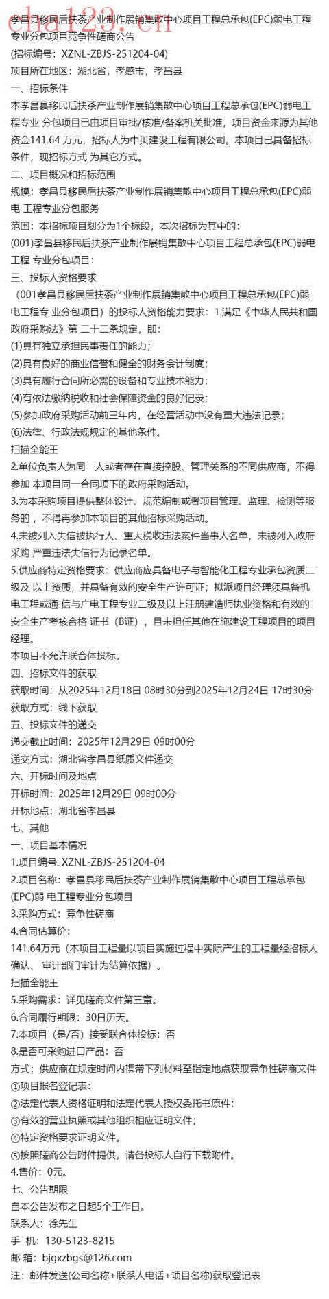 孝昌县移民后扶茶产业制作展销集散中心项目工程总承包(EPC)弱电工程专业分包项目竞争性磋商公告 郑重声明:本文版权归原作者所有,转载文章仅为传播更多信息之目的,如作者信息标记有误,请第一时间联系我们修改或删除,多谢。