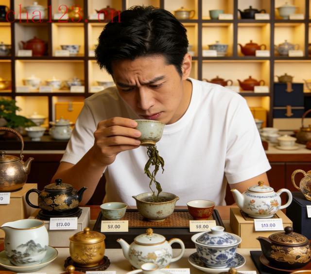 五杯茶一字排开,最贵的八千,最便宜的市场尾货三十。