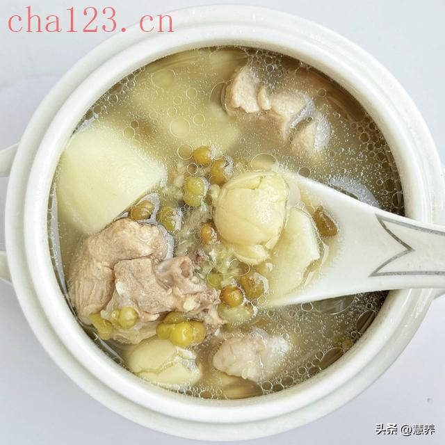 3. 山药莲子绿豆瘦肉汤食材:瘦肉200克、山药半根、莲子20克、绿豆30克、陈皮1小片。做法: