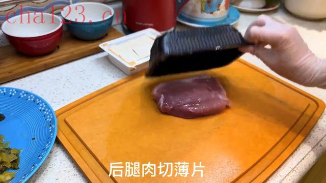 ·后腿肉切薄片,姜、盐、生抽、胡椒、一碗红薯淀粉,揉成这样。
