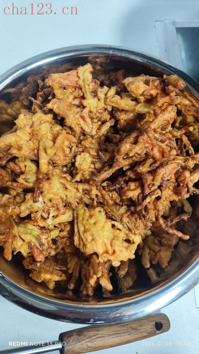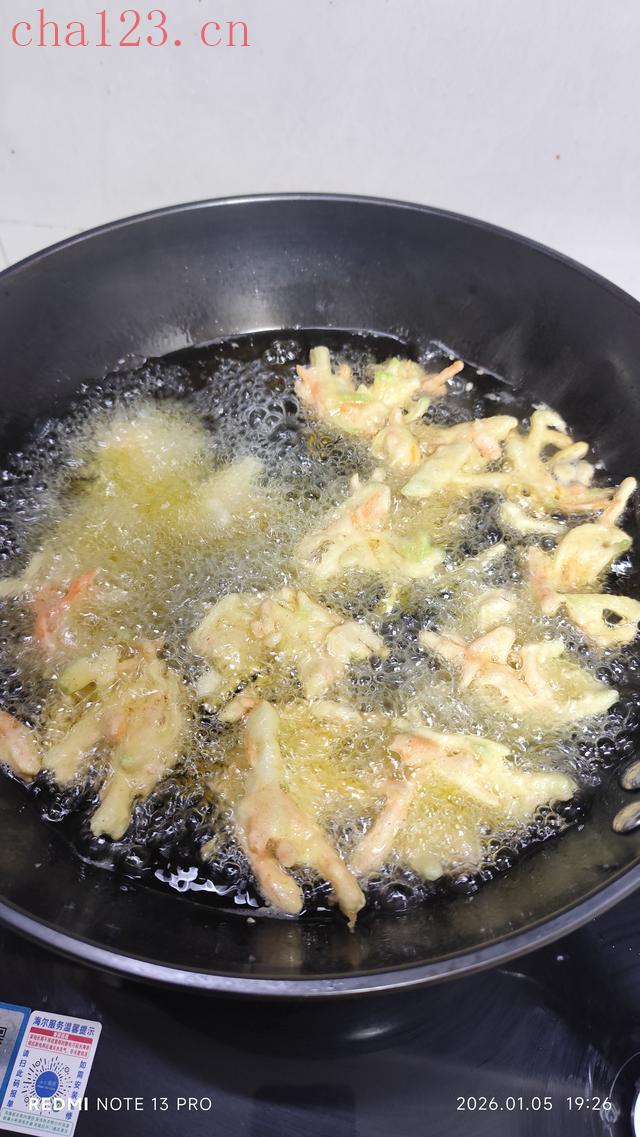 锅里倒油烧热,把面糊摊成小饼,两面翻着炸,直到金黄金黄的,捞出来那一刻香得我直咽口水!