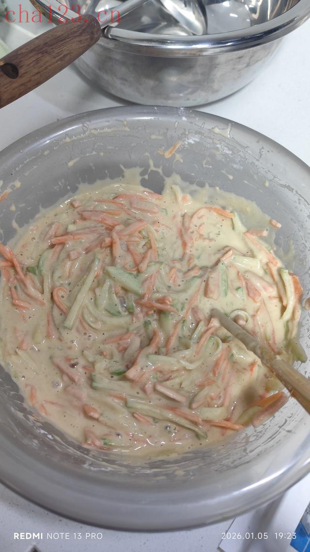 作为厨房小白,我可是纯纯的第一次挑战!先把萝卜洗得干干净净,切成细丝——越细越好炸,可惜我刀工实在拉胯,切得粗细不均,凑活看吧!