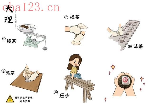 拼配、称量,一般是指采用不同原产地、不同风味、甚至不同年份的茶叶,按照配方进行配比和加工;蒸揉,是利用水蒸气软化茶叶,软化后倒入布袋中,用力紧实茶叶;压制成型,是利用双手和工具,使沱茶呈紧压形态。传统的沱茶压制方法经历了从铅饼、石墩压制到压茶凳压制的不同阶段;脱袋、干燥,把压制好的茶叶从布袋中取出,置于木框上晾干。
