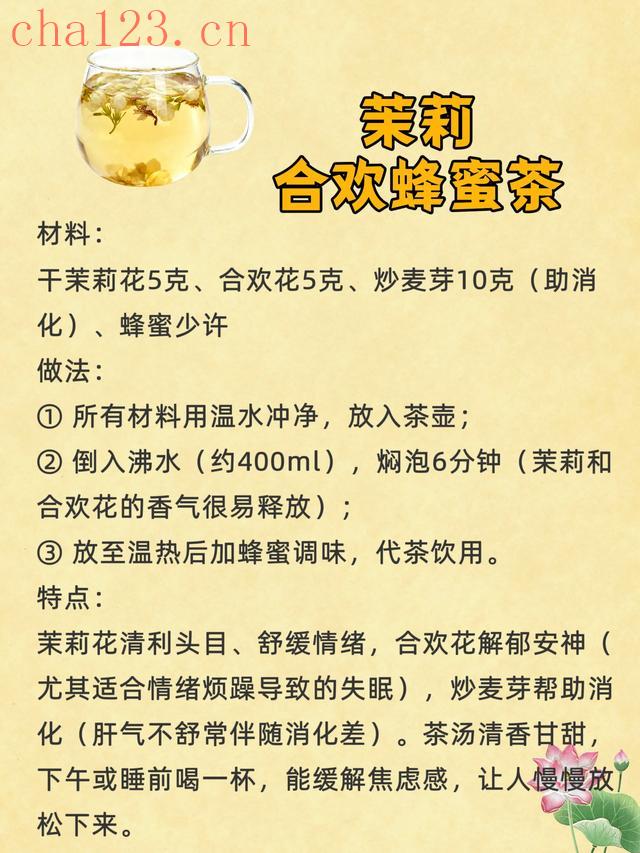 干茉莉花5克、合欢花5克、炒麦芽10克(助消化)、蜂蜜少许