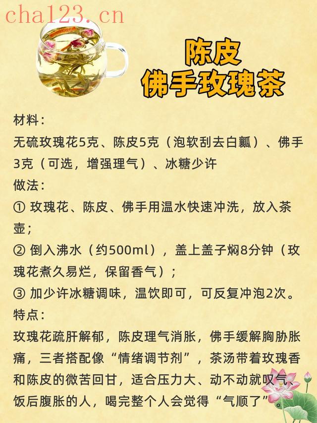 玫瑰花疏肝解郁,陈皮理气消胀,佛手缓解胸胁胀痛,三者搭配像“情绪调节剂”,茶汤带着玫瑰香和陈皮的微苦回甘,适合压力大、动不动就叹气、饭后腹胀的人,喝完整个人会觉得“气顺了”。