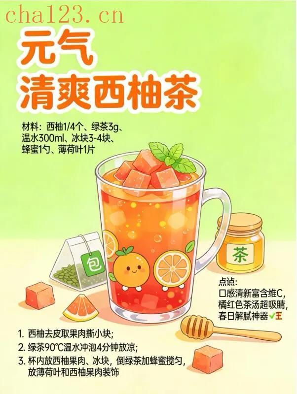 取1/4个西柚,剥出果肉,3g绿茶泡凉备用。杯中加冰块,放入西柚果肉,倒入凉绿茶,加一勺蜂蜜、一片薄荷叶装饰。西柚的微酸混合绿茶的鲜爽,入口清新解腻,橙红果肉颜值超高,喝着提神又养颜,外卖党、上班族闭眼冲。