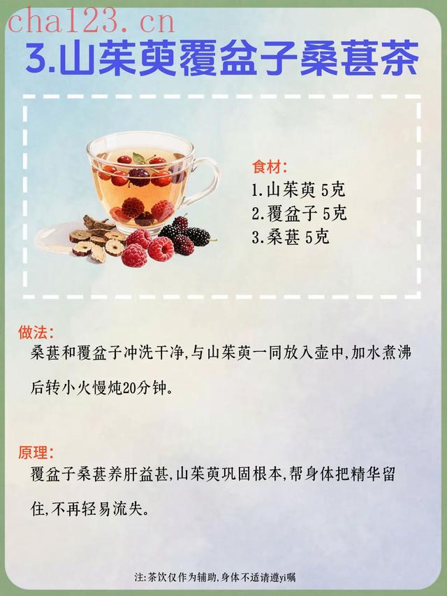 3. 山茱萸覆盆子桑葚茶食材:山茱萸5克、覆盆子5克、桑葚5克