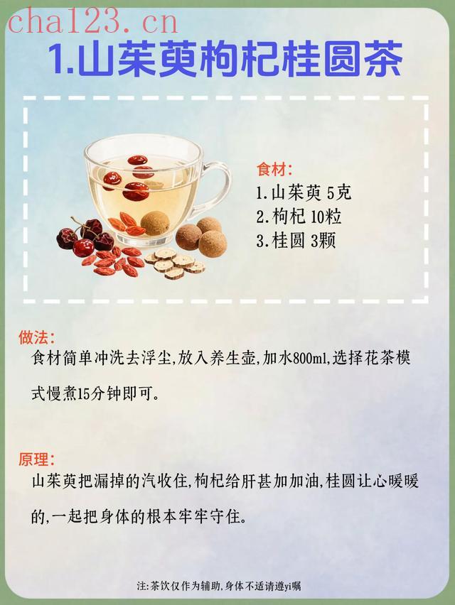 1. 山茱萸枸杞桂圆茶食材:山茱萸5克、枸杞10粒、桂圆3颗