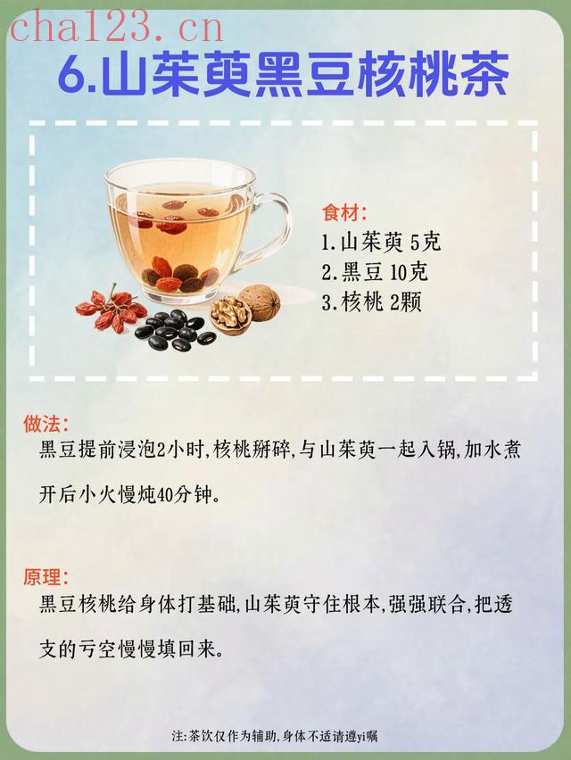 6. 山茱萸黑豆核桃茶食材:山茱萸5克、黑豆10克、核桃2颗