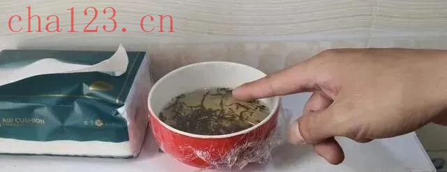 准备一碗,半包或一把茶叶,倒入常见白醋到能没过茶叶,再加一点水,浸泡十分钟,封膜戳孔,放上层靠后位置。