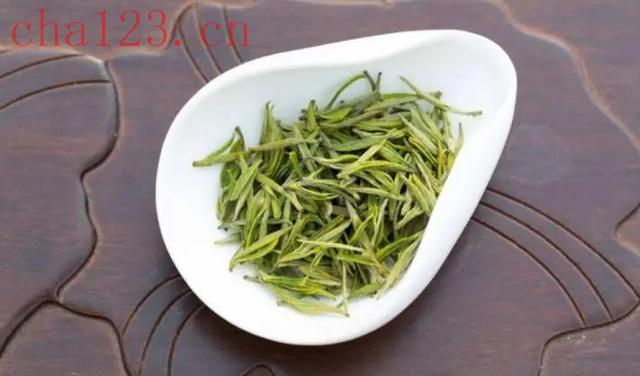 3、赏茶:将预备冲泡的“安化松针”干茶装入茶碟或小茶样盘中,送到客人面前观赏,包括观赏干茶的外形、色泽、闻干茶的香气。