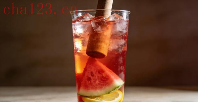 步骤:西瓜薄片铺杯底轻压出汁,加柠檬、糖浆、冰块,倒茶摇匀即可。