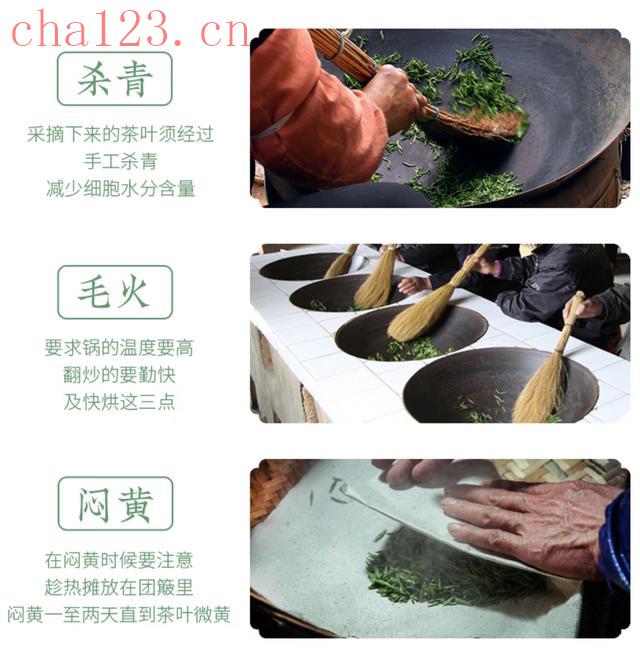 鲜叶采摘→杀青(做形)→毛火→闷黄→足火→拣剔→复火。