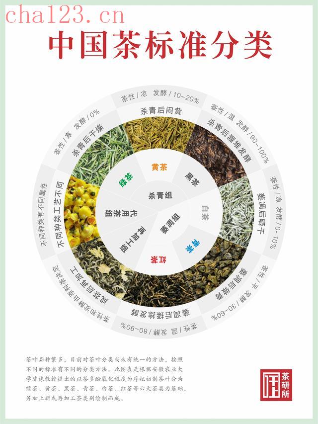 我国茶叶品种繁多,目前对茶叶的分类尚未有统一的方法,按照不同的标准有不同的分类方法,比如按茶树形态可以分成大乔木茶、小乔木茶、灌木茶三类。下图是根据安徽农业大学陈椽教授提出的按茶多酚氧化程度把初制茶叶分成杀青组和萎凋组两大类,其中杀青组包括绿茶、黄茶和黑茶三类,萎凋组包括白茶、青茶和红茶三类,共六大茶类,另加上在加工茶和代用合计八类绘制而成,供茶友们参考。