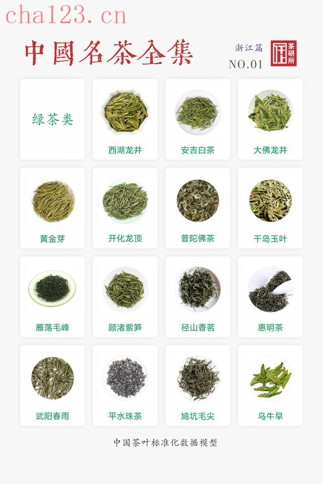 西湖龙井、安吉白茶、大佛龙井、黄金芽、开化龙顶、普陀佛茶、千岛玉叶、雁荡毛峰、顾渚紫笋、径山香茗、惠明茶、武阳春雨、平水珠茶、鸠坑毛尖、乌牛早、天台黄茶、临海蟠毫、羊岩勾青、千岛银针、钱塘龙井、遂昌银猴、天目青顶、兰溪毛峰、江山绿牡丹、越乡龙井、狮峰龙井、松阳银猴、华顶云雾、双龙银针、泉岗辉白、日铸雪芽、建德苞茶、淳安大方、华鼎云雾、瀑布仙茗