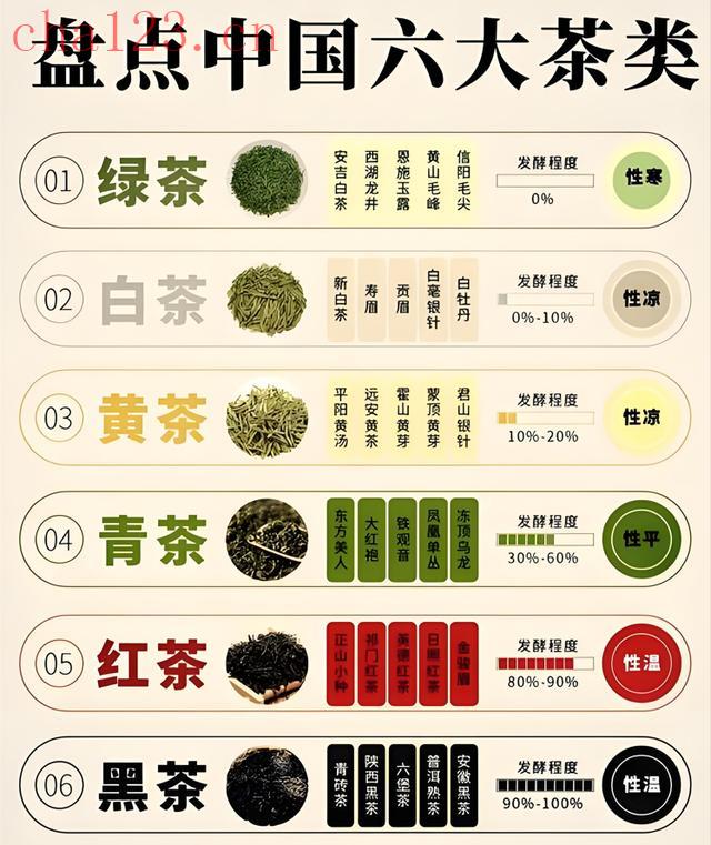 简单区分六大类茶的方式是按照茶叶的发酵和转化程度不同,加以区分。发酵从轻到重分别是绿茶(不发酵)、白茶(微发酵)、黄茶(轻发酵)、青茶(半发酵)、红茶(全发酵)和黑茶(后发酵)。如果每类茶叶只能选一个作为代表,那么应该怎么选才最合理呢?