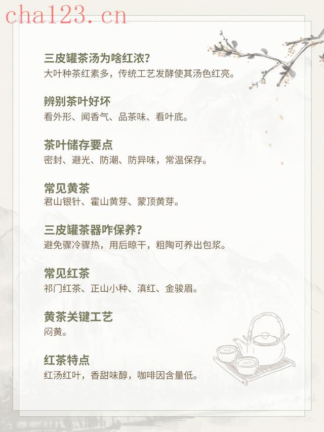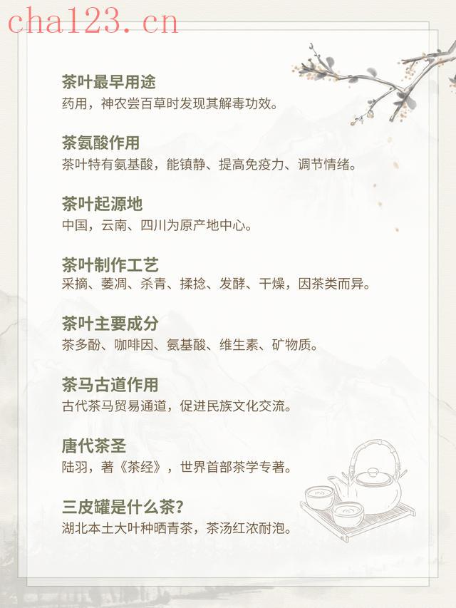 导语茶友们快看过来!还在纠结茶叶知识太零散?还在好奇三皮罐的荆楚茶韵咋这么绝?今天这篇茶叶常识 100 问 三皮罐独家干货直接把喝茶门槛打下来!从茶叶起源、制作工艺到三皮罐的历史泡法,一站式给你讲明白,收藏它,喝茶小白也能秒变懂茶达人!