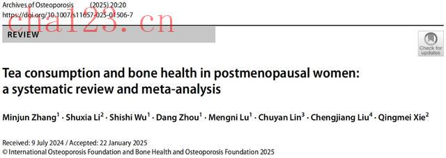 [3]ZHANG M, LI S, WU S, et al. Tea consumption and bone health in postmenopausal women: a systematic review and meta-analysis[J]. Arch Osteoporos, 2025 Feb 5; 20(1): 20. DOI: 10.1007/s11657-025-01506-7.