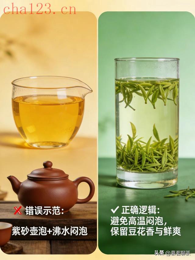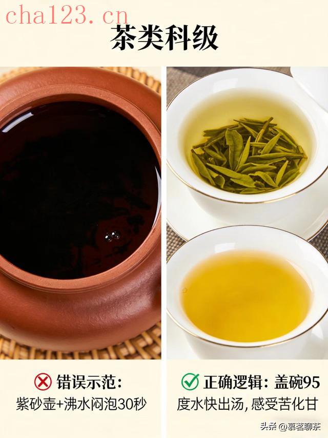 * ✅ **正确逻辑**:紫砂壶吸香且散热慢,沸水闷泡会导致龙井的豆花香瞬间消失,取而代之的是熟汤味(类似煮熟的青菜叶味),汤色变黄浑浊,鲜爽感全无。