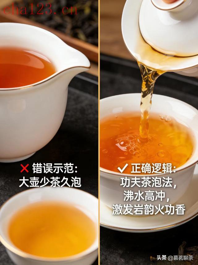 * ✅ **正确逻辑**:岩茶讲究 **“岩韵”** ,必须用“功夫茶”泡法。如果像喝绿茶一样用大杯泡,岩茶的霸气、桂皮香、花果香会被水稀释殆尽,只剩苦涩。必须沸水高冲,激发岩茶的“火功香”。