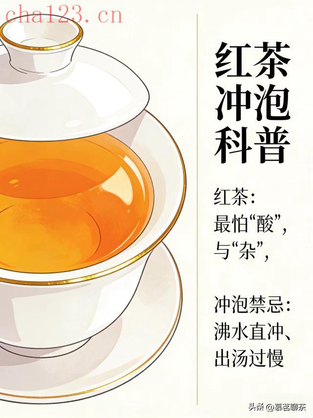 红茶是全发酵茶,茶性温和,滋味甜醇。**冲泡禁忌:沸水直冲、出汤过慢导致“酸”味出现。**