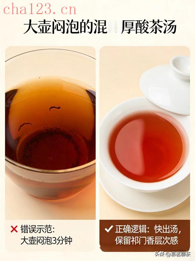 * ✅ **正确逻辑**:祁红以“似花、似果、似蜜”的“祁门香”闻名。长时间闷泡会导致香气挥发,茶汤产生“厚酸”感,失去层次感。