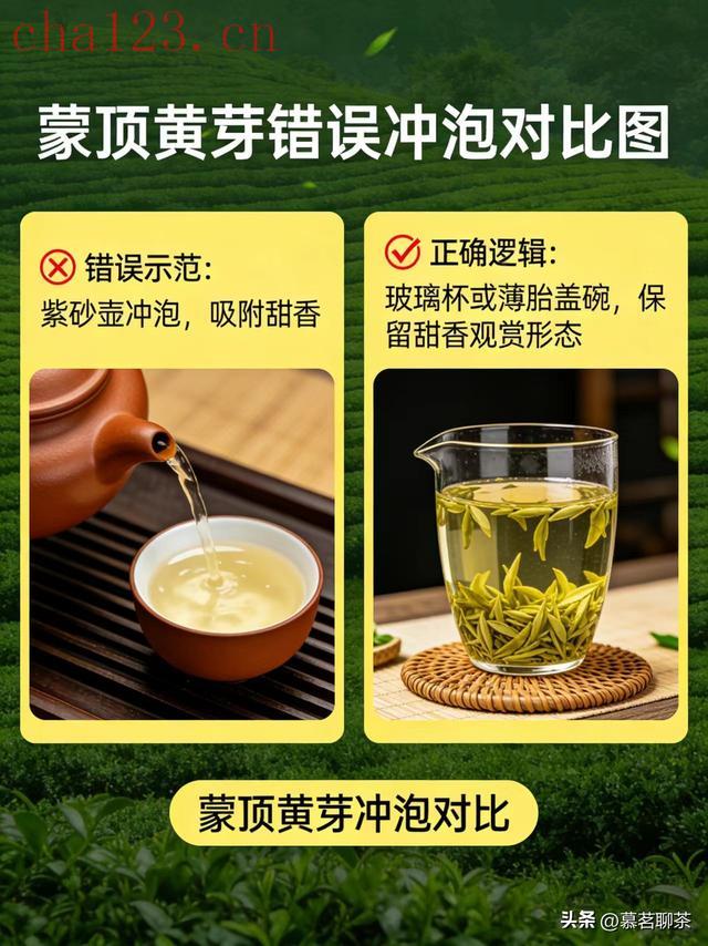 * ✅ **正确逻辑**:蒙顶黄芽的香气清高,紫砂壶会吸附其细腻的甜香,建议使用玻璃杯或薄胎盖碗观赏其芽叶形态。