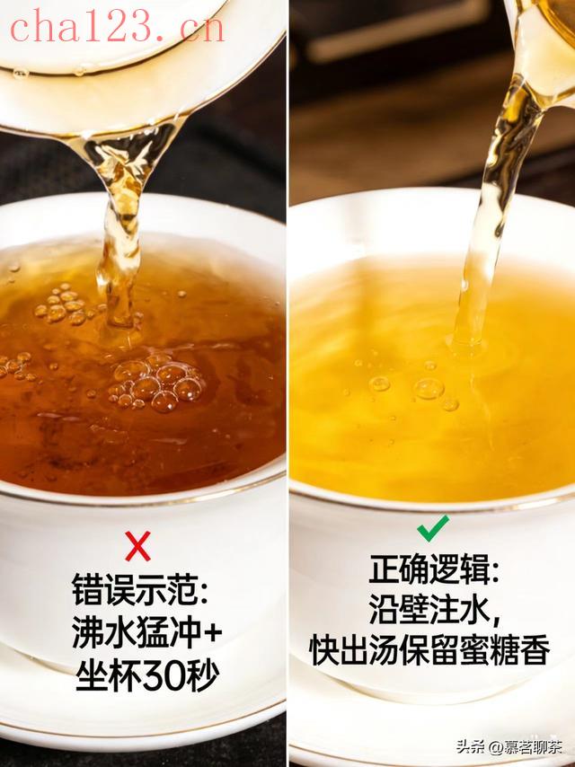 * ✅ **正确逻辑**:金骏眉是单芽制作,极其细嫩。沸水直冲且坐杯,会让其“蜜糖香”转化为“酸梅味”,口感发涩。正确应沿杯壁定点注水,快速出汤。