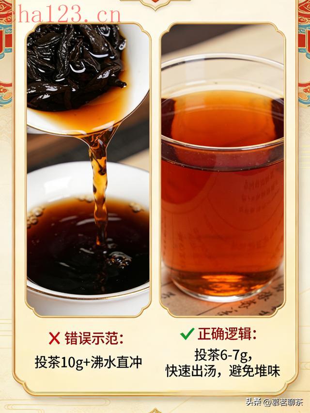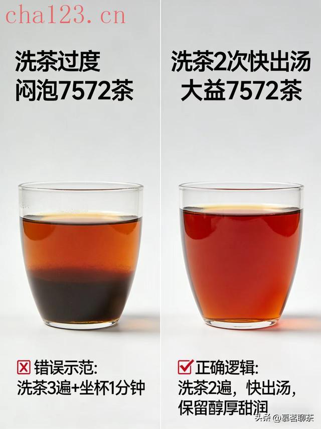 * ✅ **正确逻辑**:7572是标杆熟茶。洗茶2遍足够,洗多了内含物质流失。若长时间闷泡,熟茶里的纤维素和茶多糖过度析出,口感会变得“寡甜”带酸,且汤色浑浊发黑,失去“红浓明亮”的品相。