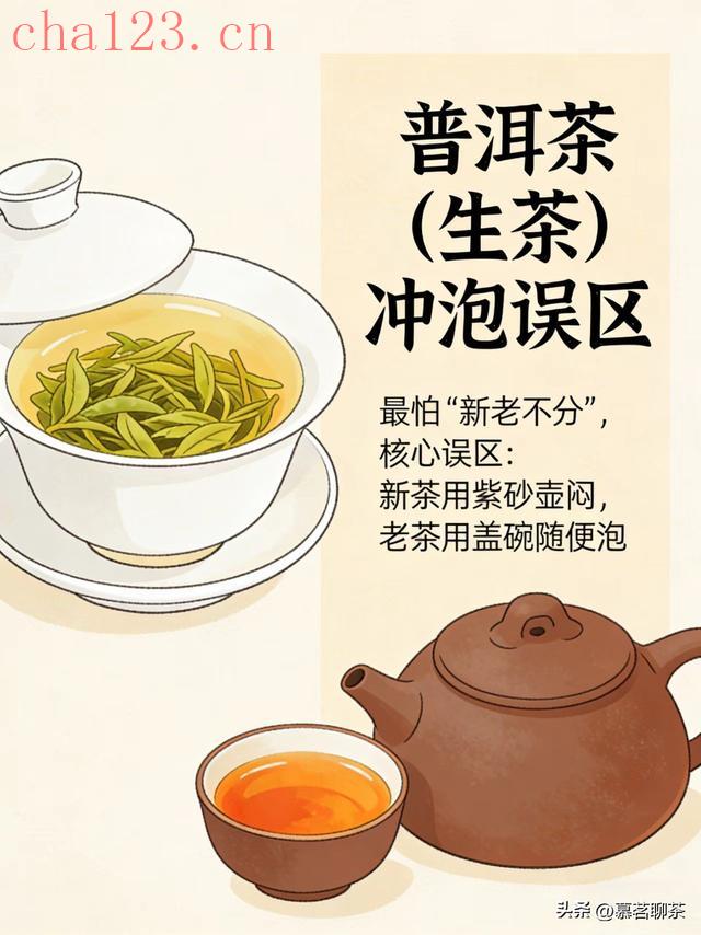 普洱生茶是后发酵茶的初始形态,新茶寒烈,老茶温润。**核心误区:新茶用紫砂壶闷,老茶用盖碗随便泡。**