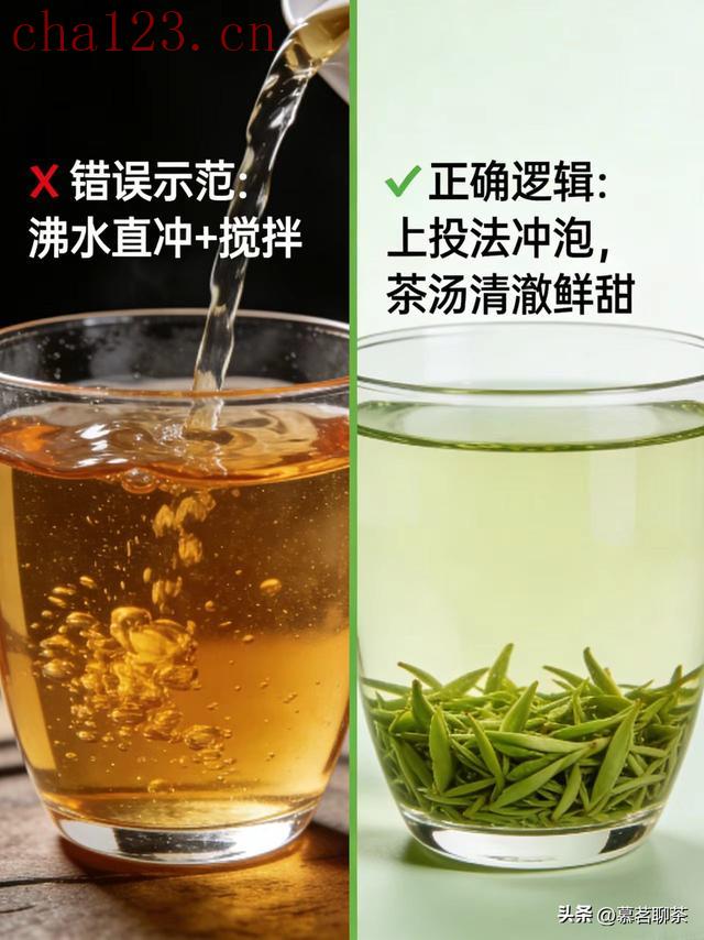 * ✅ **正确逻辑**:碧螺春绒毛多,芽叶嫩。正确应用 **“上投法”** (先倒水,后放茶),让茶自然下沉。若直接沸水冲击,茶汤会变浑浊,苦涩物质瞬间析出。