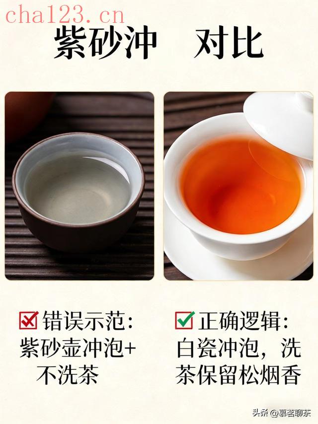 * ✅ **正确逻辑**:传统正山小种有松烟香或桂圆味。紫砂壶会吸附其独特的松烟香,导致韵味缺失。且松烟香的第一泡应作为“润茶”洗掉浮尘。